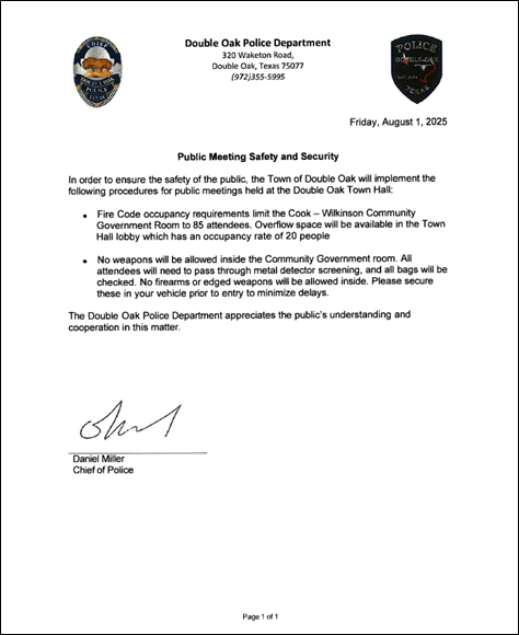 In response to rising safety concerns at public meetings across the country, the Town of Double Oak is implementing enhanced procedures to ensure a secure and respectful environment for all attendees. While Double Oak remains a close-knit and civically engaged community, recent discussions such as those surrounding a proposed helistop have drawn heightened attention and commentary on social media platforms like Facebook. As community participation grows, so does the importance of maintaining safe and orderly public forums.